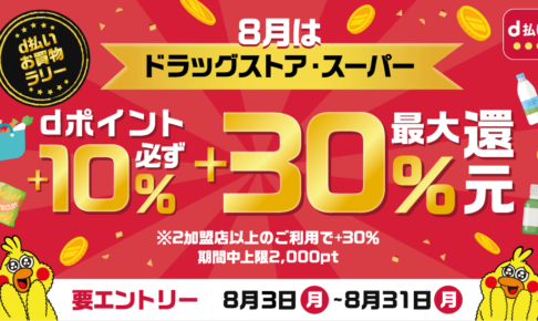 【d払い】ドラッグストア・スーパーで最大30%還元!2店舗買いまわり エントリー期間中にキャンペーンにエントリーし、条件を達成した方に支払い総額の10%または30%のdポイント(期間・用途限定)をキャンペーンポイントとし…
