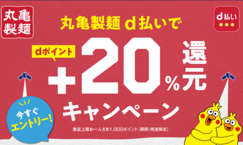 【1月31日まで】丸亀製麺 d払いで+20%還元キャンペーン 期間中、エントリーして、全国のd払い利用可能な丸亀製麺の店舗での支払いの際に、「d払い」アプリで1会計あたり500円(税込)以上の支払すると、もれなく決済金額…