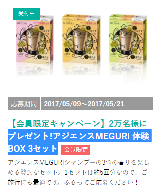 アジエンスMEGURIシャンプー 体験BOX 3セット MNP掲示板会員様から情報を頂きました。 いつもありがとうございます。 「Kao PLAZA」ではプレゼントキャンペーンが結構あります。 会員登録が必要ですが、20…