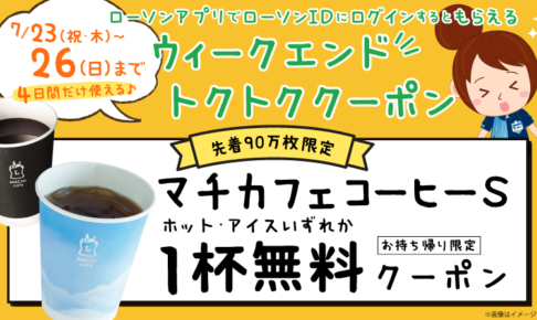 【ローソンアプリ限定】先着90万名 「マチカフェ コーヒー(S)/アイスコーヒー(S)」1杯無料 ローソンアプリにローソンIDでログインすると、「マチカフェ コーヒー(S)/アイスコーヒー(S)」1杯無料クーポンが配布さ…