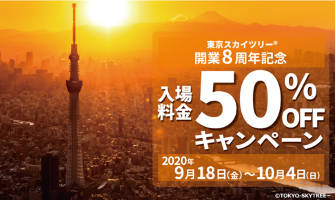 【10月4日まで】東京スカイツリー 開業8周年記念 入場料金 50%OFFキャンペーン! 「東京スカイツリー 開業8周年記念」で入場料金が50%OFFとなっています。 重要ポイント 実施期間:2020年9月18日(金)~…