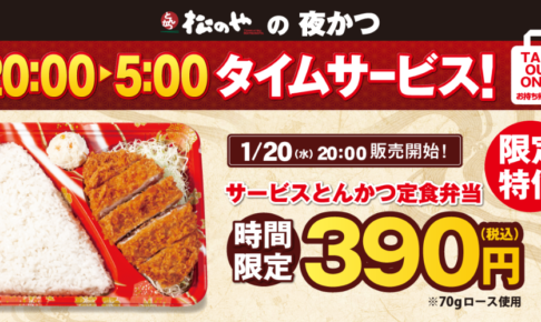 【松のや】20:00~5:00限定で「サービスとんかつ定食弁当」390円!! 「松のや」で「サービスとんかつ定食弁当」が販売されています。 緊急事態宣言の発令を受けたエリアでの販売で、20:00~5:00限定販売です。 …