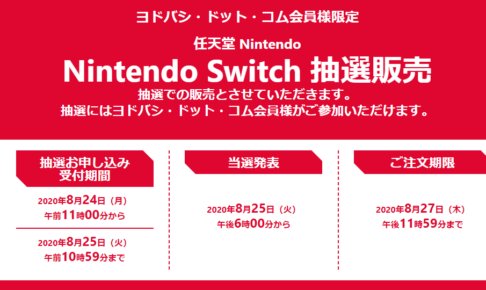 【8月25日 10:59まで】ヨドバシ・ドット・コムで「Nintendo Switch 本体 各機種」抽選販売 ヨドバシ・ドット・コムで「Nintendo Switch 本体 各機種」抽選販売されています。 申し込み期間…