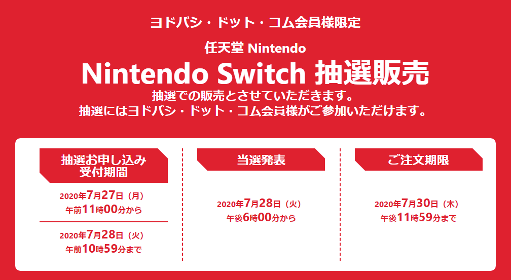 【7月28日 10:59まで】ヨドバシ・ドット・コムで「Nintendo Switch 本体 各機種」抽選販売