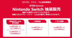 ヨドバシ・ドット・コムで「Nintendo Switch 本体 各機種」抽選販売されています。
