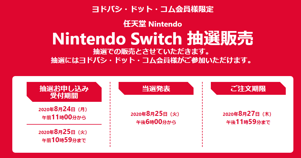 【8月25日 10:59まで】ヨドバシ・ドット・コムで「Nintendo Switch 本体 各機種」抽選販売