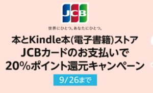 現在、「Kindle書籍」を「JCBカード(クレカの他、デビットやプリカも含む)」で購入すると20%ポイント還元されるキャンペーンが開催されています。