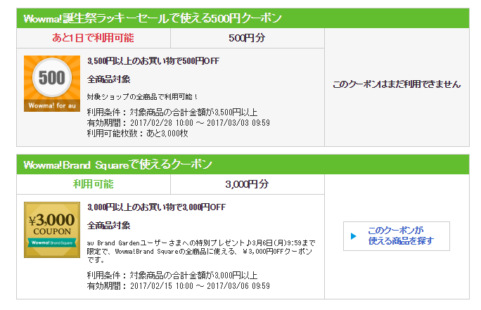 下記のようになっていたら「3,000円クーポン」「500円クーポン」が取得できている事になります。