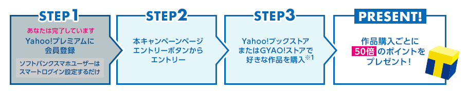 Yahoo!プレミアム会員の方は、「超絶エンタメ祭」に参加できます。 50倍のポイントの獲得手順はこんな感じです。