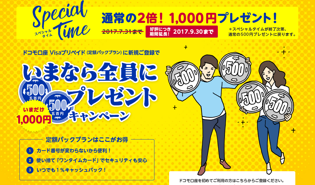 Docomo2017.09.01 生活向上アンテナ ドコモ口座 VISAプリペイド(定額パックプラン)登録で1,000円が貰える! ツイート シェア はてブ LINE Pocket ドコモ口座 VISAプリペイド 定額パックプラン 読者の皆様ならドコモ回線たくさん持っていますよね? 最近は「docomo with」の登場で、回線が増えている人も多いと思います。 ドコモ回線が増えたら、ドコモ口座 VISAプリペイド(定額パックプラン)に登録していきましょう。 登録するだけで、1,000円がドコモ口座に入金されます。 このキャンペーンは先月までだと思っていましたが、9月30日までに延長されたようです! はやくキックバックキャンペーン始まらないですかね~ 待ち遠しいです(笑 開催中のキャンペーン(2026年01月12日 現在)実施中★楽天市場★おすすめ商品を随時更新中 ツイート シェア はてブ LINE Pocket feedly コメントを残す コメントをキャンセル メールアドレスが公開されることはありません。 * が付いている欄は必須項目ですコメント 名前 * メール * サイト 新しいコメントをメールで通知 新しい投稿をメールで受け取るemail confirm* post date* 日本語が含まれない投稿は無視されますのでご注意ください。(スパム対策)