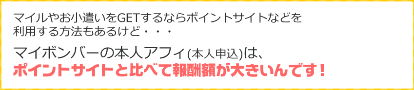 「ポイントサイト」を利用している人も多いと思いますが、「本人アフィリエイト」が利用できる「マイボンバー」の方が、報酬が高い案件もあります。