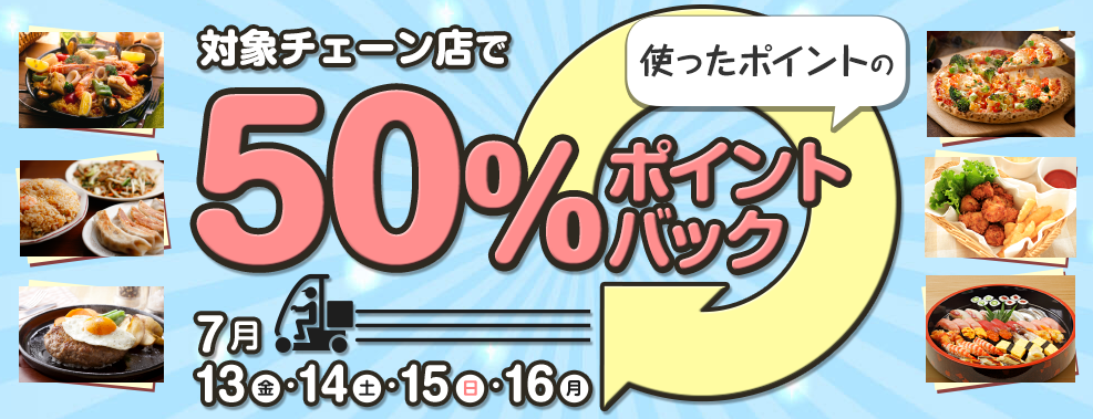 4日間限定で、キャンペーンにエントリーして対象チェーン店でdポイントを利用して注文すると、利用ポイントの50&がポイントバックされます。