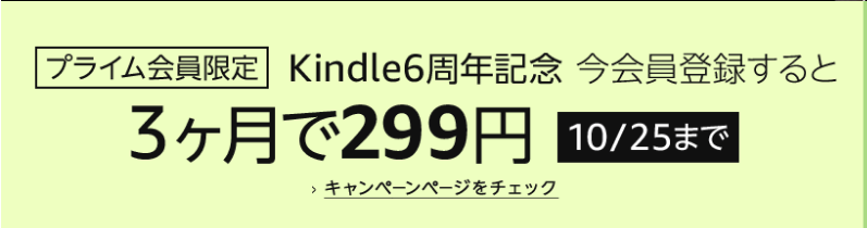 プライム会員限定ですが、Kindle6周年記念で「Kindle Unlimited」に登録すると、3ヵ月で299円で利用可能です。