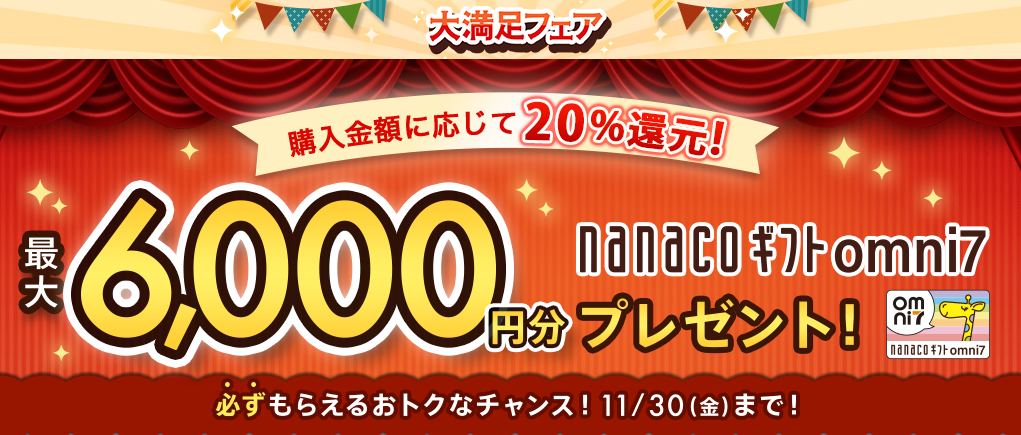 期間中の累計注文金額に応じて、nanacoギフトomini7が最大6,000円分獲得可能です。