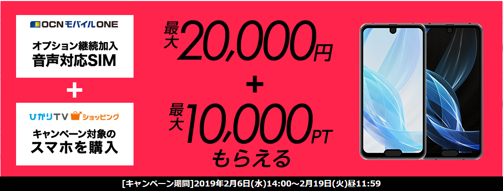 「最大2万円 + 最大1万PTもらえるキャンペーン」は、期間中にエントリーして、キャンペーン対象のスマートフォーンを購入し、OCNでんわ かけ放題オプション+マイセキュアに加入すると「現金最大2万円のキャッシュバックとぷららポイント最大2万ポイント」が貰えるキャンペーンになります。