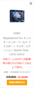PlayStation4 Pro モンハンワールド ポイント15倍 実質32,713円 買取価格35,000円